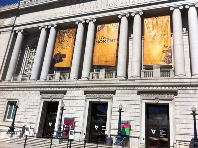 "今日は、第一日曜日だった!" 市役所近くでの用事はともかく、Asian Art Museum(アジアン美術館)へ先に行く事にしました。 行列もなかったので、玄関で簡単な荷物検査の後、カウンターで入場券兼スティカーをもらいました。