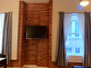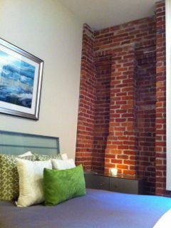 壁の一部が、煉瓦になっていますが、この建物のオリジナルです。 1908年に建てられたビルで、100年以上の "アンティーク" なウォール。 壁掛けTVとのバランスが今昔を感じさせます。 サンフランシスコは、1906年大地震で被災していますがその二年後に、ホームテレフォンカンパニー本社・電話交換場所として使っていた建物をS.F市が、1981年に歴史的建造物として指定しました。 残す所は残しリモデル、一階はブティック、上はコンドミニアムとして使ってます。