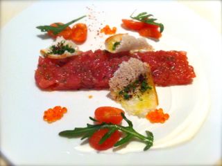 プリフィックスで、アペタイザー・メインコース・デザートから各一皿ずつ選んで3品。 アペタイザーからツナとハマチ、メインからビーフとダック、最後のデザート2品と二人で6種類の料理を選び、どれも大変美味しく、楽しく頂きました。