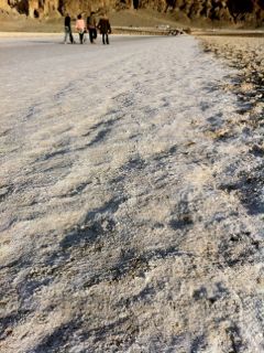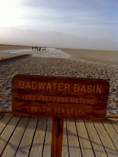 『BADWATER BASIN(バッドウォーターベイズン)』 海抜−85.5m の塩の道。 踏み固めらていない部分を削ってみたらかなり固くて、なめてみたらビリッと塩っぱかった。 これが、いわゆる "岩塩" なのね。