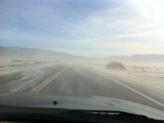 「シオ嵐」って教えてもらいましたが、細かな砂が巻き上げている砂嵐。 雪山での "ホワイトアウト" と同じように、一瞬にして視界が悪くなってライトをつけないと対向車とぶつかりそう。 しかし、滅多にすれ違わない対向車よりカーブが見えにくい方が怖い。