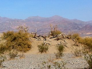 骨のような不気味な木が青空とウラハラの 『Mesquite Flat Dunes(メスキートフラットデューン)』 砂丘の黄色がユニークなのですが、眺めていたら喉が渇いてきました。