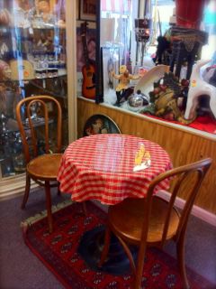 店内でアンティークを見ながら食べる事もできます。 もの静か風面持ちのおっちゃんとは裏腹に、優しい乙女なアンティークに可愛らしげなテーブルクロス。 ペストリー、パイ、クッキーやケーキを作るのとアンティーク以外は、あまり気にする方でもないようで、紅茶は、ティーバックを選んで自分でお湯を注いで座ってどうぞ〜。 という感じ。