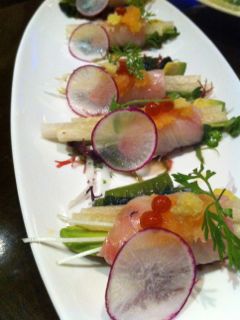 カンパチは、ヒカマ、カイワレ、などが巻いてあってユズポン酢で!