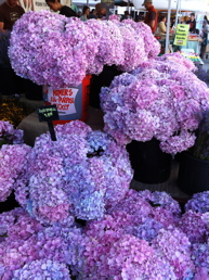 "朝市" では、アジサイが売り場の中心にありました。 日本のアジサイの色は、青や紫が多いのですが、こちらはピンク色が主流です。 夏の野菜がどんどん出回っていてレストランの方達も茄子、トマト、サマースクワッシュあたりを仕入れてました。