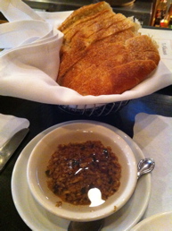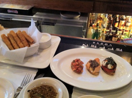 カウンターに座り、飲み物を注文すると自家製フォカッチャがでてきます。 揚げニンニクのオリーブオイルにつけて! ⇒ 結構いけます。 ズッキーニ・スティク($4) ミニベジピザ($5)は、ロースト・ベルペッパー、マッシュルーム、オニオン、フェタチーズ。 オーブンローストのムール貝($8.95)まで頂くと "しっかりディナー" となります☆