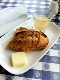 席に着くと先ず "パン" が出てきます。 白いお皿に乗ったごく普通のイタリアンブレッドですが、実はこれ完全に切れているのではなく、下が全部くっついているのです。 レストランによっては、全部バラバラに切って出てくるところもあるのですが‥。