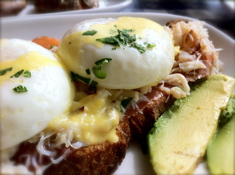 お勧めは、"Crab & Smoked Salmon Benedict" Smushed Dutch Creamer Potatoes付き $17.95