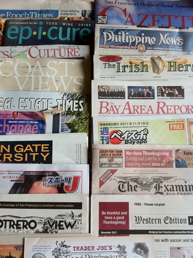 日本の方なら日系スーパーや日本食レストランに置いている "Jスポ" "スポーツJ" は、ベイエリアを中心に生活情報、売ります買います情報、領事館からのお知らせ、法律相談、選挙の告示が掲載。 アイリッシュ・パブには、アイルランド・ヘラルドという無料新聞、フィリピンニュースは、フィリピン領事館近くにあります。 ノブヒル、フィルモア、ポトレロヒル、ウエスタン・アディションには、地区の話題を集めた無料情報誌が存在し、住んでいる方達の生活ぶりが見えてくるので、なかなか興味深いものがあります。