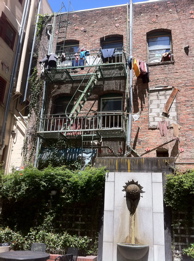 チャイナタウンの一角。 金融街との境目の路地、『毎天日間開放・PUBLIC OPEN SPEACE』 とあり、空を見上げると洗濯物が! 今日は天気がいいから‥。