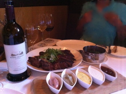 店名に 『ステーキ』 と名がつくからには、一番大きなお肉が食べたくなるのですが、"porterhouse for two – 32oz" 二人前です。 今日は、二人で来てよかったぁ〜。 サービスをしてくれている古風な眼鏡のジェフさんが、それぞれに焼き方を尋ねてきました。 ⇒ 思わず 「このお肉の "塊" は、ヒトツの注文ではないのですか?」 と確認。 だって。