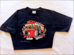 写真のTシャツ。 "ケーブルカー" ついているし、"サンフランシスコ" と書いているし、これからの季節にもちょうどよいお土産です。