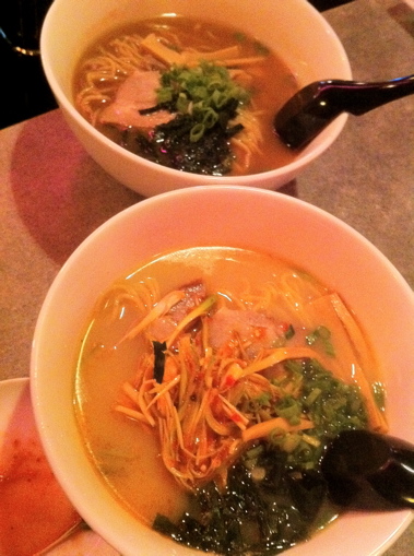 写真は、醤油ラーメン、スパイシーグリーンオニオン塩ラーメン。