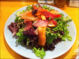 「オヤジさんとこは?」って尋ねてみたら、心配のお礼かしら 「もうちょっと乗せちゃえ!」 ってカウンター向こう側から聞こえました。 とびきり派手なトッピングのシーフードサラダ。