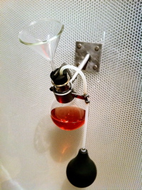 ワインの香りをかぐ事ができる "理科実験装置" 右下の黒いゴムボールを握ると、空気がフラスコ内に送り込まれ、ロートに鼻を近づけると、香りが分かる。