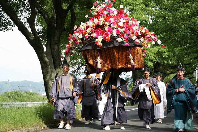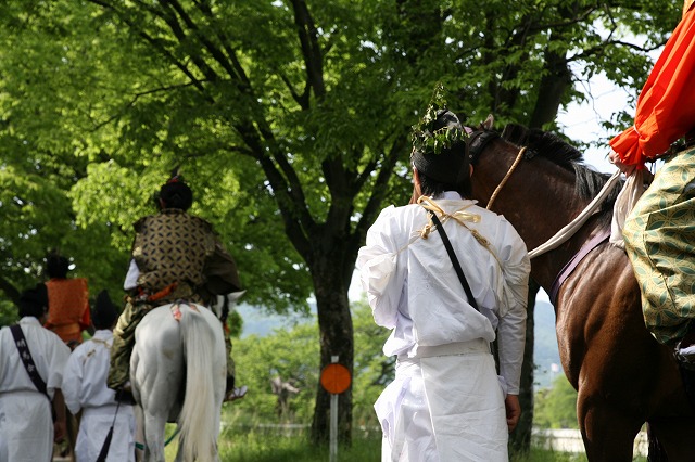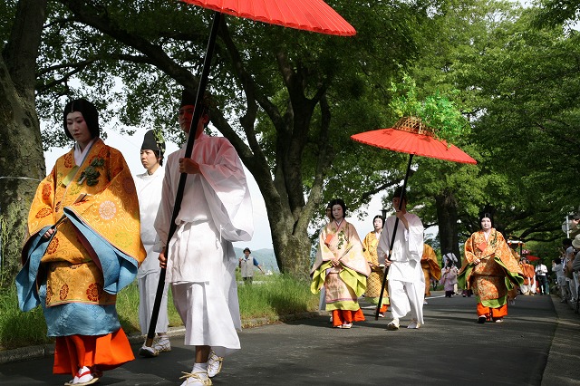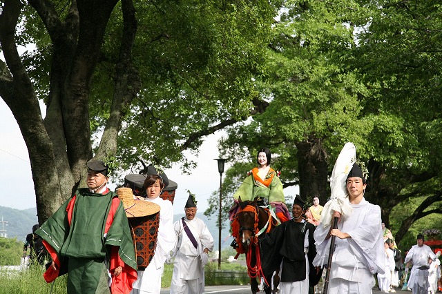 緑の中、フタバアオイの葉を付けた女官や武官、
