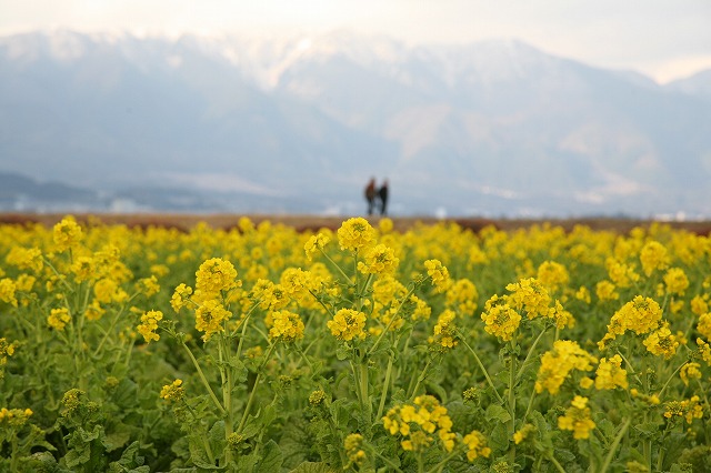 菜の花畑の向うには、比良山系の山々が広がっています。