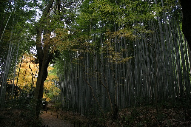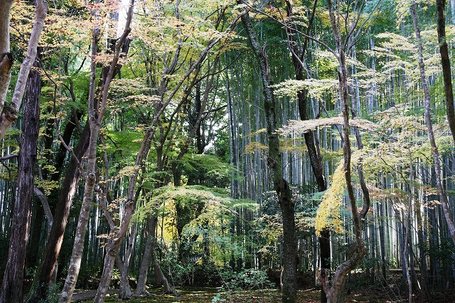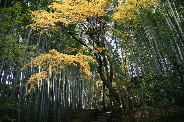 光を遮る竹林ドームの中に 黄色の もみじが 広がっています。