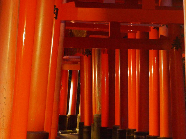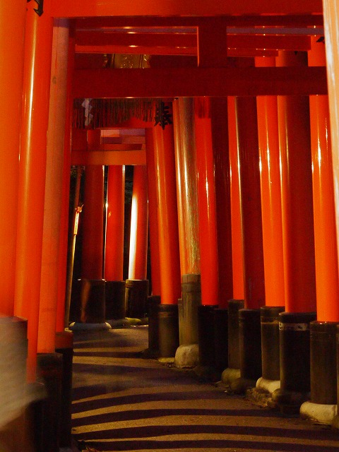 漆黒の夜が広がる稲荷山・・・・・・・・千本鳥居形が 地面に写っています。