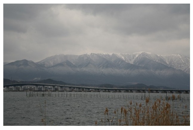 琵琶湖大橋の 後方には 雪を頂く比良の山々が見えます。