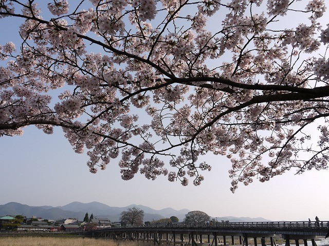 早朝の嵐山では 美しい桜に 出会えました。朝が早くて 渡月橋渡る人も