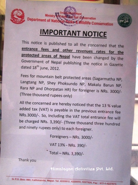 カトマンドゥ市内ネパールツーリズムボード(以下NTB)にある国立公園事務所担当係員によると「3月1日より値上げとなっており、この日から値上げ額を徴収している」とのことですが、事務所内の掲示物には、明確な日付の記載はありません。