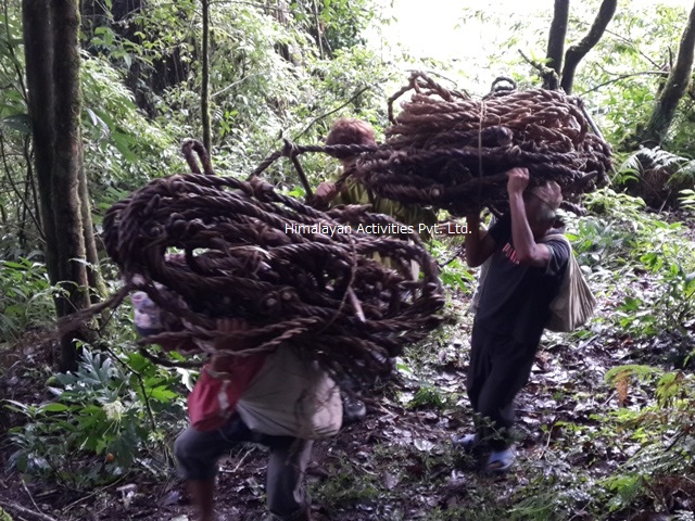 蜂の巣は、人間や動物たちに狙われにくい、人里離れた断崖絶壁に作られます。ハニーハンターたちは、竹製の頑丈な縄ばしごを担いで、蜂の巣を目指します。