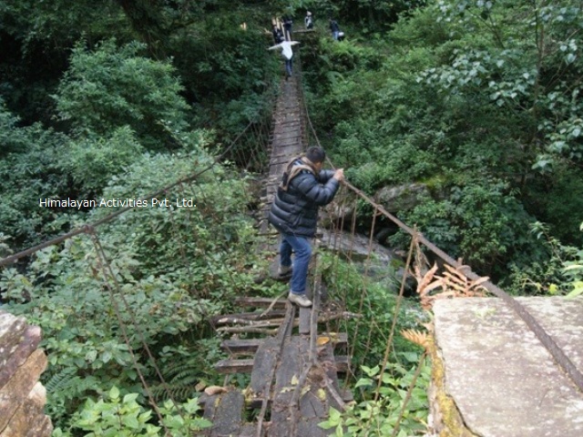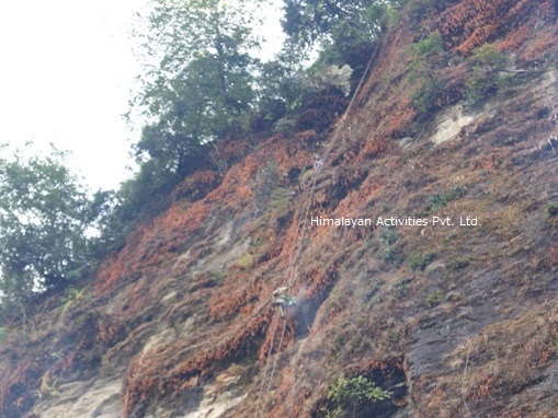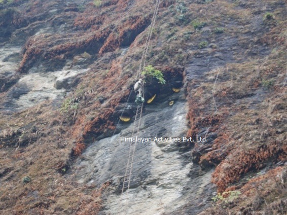 一方、崖の上からは、長い縄ばしごをたらし、ハニーハンターがこのはしごを下り、蜂の巣を目指します。