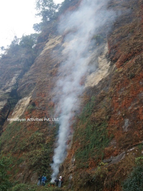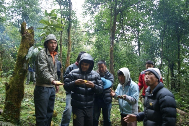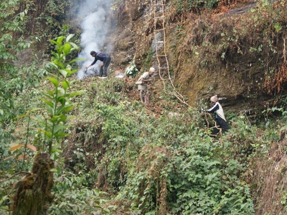 目的地へ着くと、蜂の巣がある崖の下で、木々を燃やし始めます。蜂の巣から蜂を追い払うためです。崖の高さは約80m。煙が高くまで届くよう、どんどん燃やします。