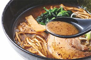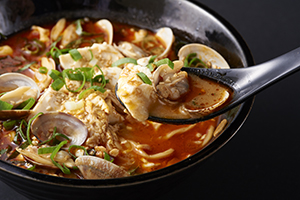 スープのベースは100%日本産の豚の頭のみを6時間かけて作り、1日冷蔵庫で寝かせます。そこに背脂、ごま油、ニンニクなどを合わせたスープになります。麺は「柔らかめ」、「普通」、「硬め」から選びます。その上でねぎ、のり、チャーシューなどの各種トッピング(大体10ドルから30ドル)をお好みで加えます。ベーシックなのは黒琥ラーメン(80ドル)で、見た目よりもさっぱりした味なので食べやすいと思いました。同店は「香港人は辛いもの好き」と分析したので「純豆腐豚骨ラーメン」(90ドル)というのを香港専用メニューとして加えています。韓国料理と日本料理の融合みたいなところがありますが、アサリが中に入っていてそのエキスがスープに染みています。