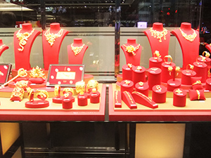 香港最大手の貴金属店、周大福(Chow Tai Fook)にいってみました。すると、ありました、金色のディスプレーが。ブレスレット、指輪、イヤリング、ネックレスなど金のアクセサリーのオンパレード。値段は大体4、5桁の数字が中心です。店内をチラッと見ましたが、店員と真剣に会話をしている中国人の姿がありました。