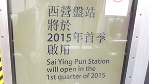 香港島北部を横断する港島線(Island Line)は西側の起点/終点が上環(Sheung Wan)駅でしたが12月29日に香港島最西部の堅尼地城(Kennedy Town)まで延伸され開通しました。駅は上環のあと西営盤(Sai Ying Pun)、香港大学(HKU)、堅尼地城で、工事の遅れから西営盤駅はまだ工事が完了おらず下車できません。当面は通過駅となり2015年第1四半期のオープンを予定しています。