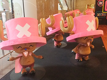 そのすぐそばには20体ものチョッパーマンが。こちらでも撮影可能です。2階にあがりアトリウムにたどり着くと、8メートルの「ゴーイングメリー号」が天井から吊り下げられる形で展示。ルフィ、ゾロ、ナミなどの9体の「麦わら一味」が並んでいてこちらも撮影ポイント。
