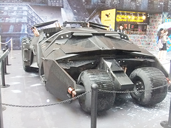 展示されているのは2008年のタンブラー、オートバイのバットポッド、1989年のバットモービルなどバットマンのなつかしの乗り物。そのほかにもコレクターが集めたバットマングッズの展示や宿敵ジョーカーと一緒の像などさまざまなものが展示されています。近づいてみてみると、今にも動きそうなほどの高い精度で作られています。時代広場内ではスタンプラリーも開催されており、3つのスタンプをもらうと限定版のバットマン・カラーリングブックがもらえます。