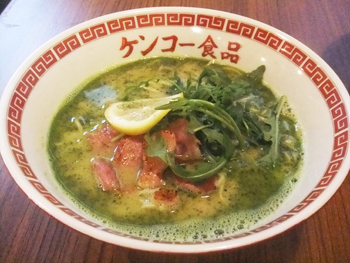 発売したばかりのちゃんぽんは、ミニサラダとヤクルトがついたセットで80ドル。写真にあるように白菜、もやし、にんじん、ほうれん草、あさり、いか、かまぼこ、半熟卵と具材たっぷり。写真下の緑色のラーメンはなんとバジルを使用(同80ドル)。バジルととんこつラーメンて合うの?と思いますが、これが意外に合うから不思議。中にはチーズが入っていてマイルドさを出しつつ、レモンがはいっているのでさっぱりとしているというラーメンです。