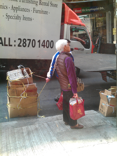 ここには様々な人が訪れますが、老人が多いのです。香港の年金システムはまだ確立して10年ちょっとと歴史がないので、高齢者の人は若かりしころの貯金を取り崩すか、子どもの世話で老後を生活してきました。ですが、貯金が少なかったり、子どもに恵まれない人もいます。そうした老人はダンボールなどをかき集めてちょっとした生活費の足しにするのです。