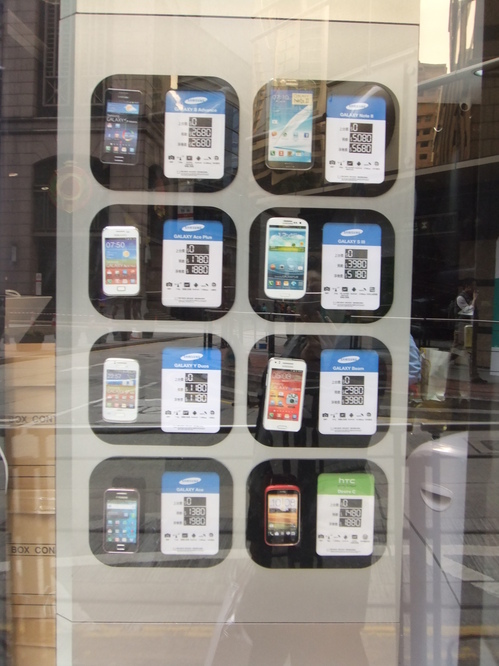 携帯電話会社のショーウインドー。日系企業は残念ながらあまり存在感なし