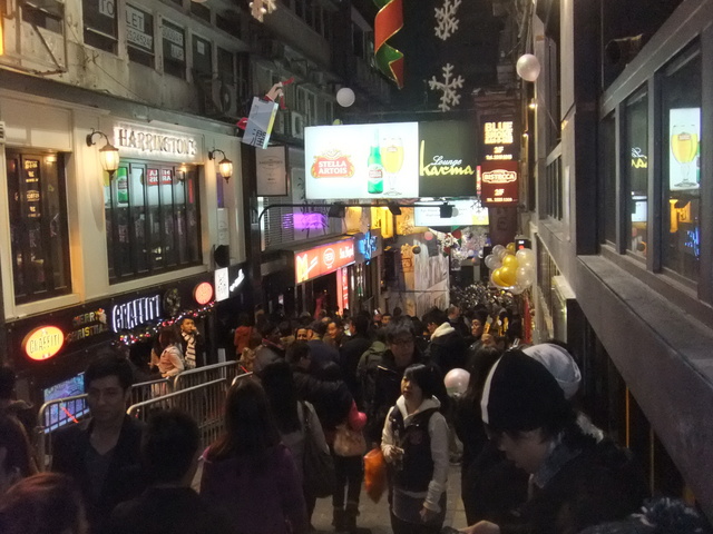 クリスマス同様に香港随一の歓楽街、蘭桂坊(Lan Kwai Fong)も人、人、人…でした。