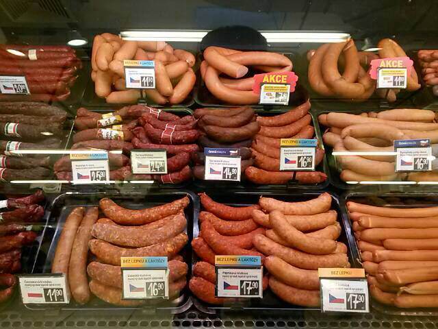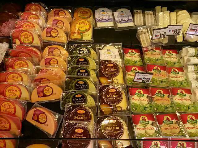 プラハのスーパーには、お惣菜、チーズ、ハム、ソーセージ、お肉などのショーケースがあります。