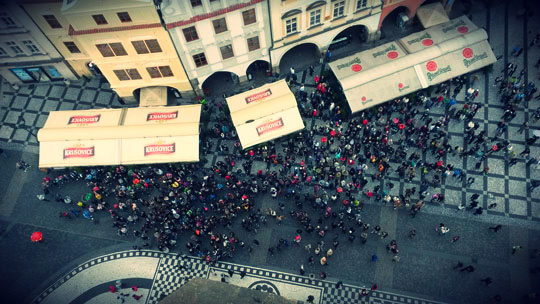 下を見下ろすと天文時計が動くのを待つたくさんの人々。