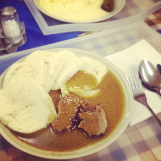 クネドリーキはチェコ独特の蒸しパンで、こういった煮込みや肉料理に添えて出てくるのが一般的です。