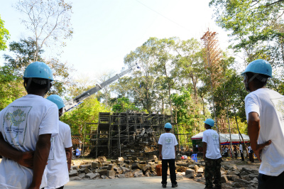 挨拶終了後はクレーンを使用し、中央塔頂部の石材を保管場所へと移動。無事式典は終了しました。今後は5年間をかけ、同遺跡の三祠堂と東テラスの解体修復を行っていくと言うことです。