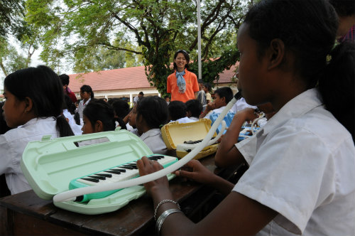 今回はカンボジアシェムリアップ州のチェイ村の小学校を訪問、400名を超す子供たちに楽器や音楽を教え、楽器を学校にプレゼントした後、カンボジア民謡「アラピア」を全員で合唱しました。