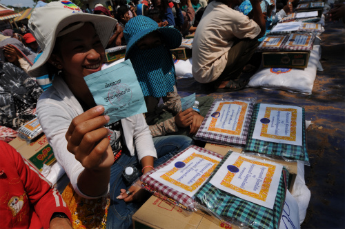 ちなみに今日は国王からの差し入れ日でした。もちろん国王は忙しい方なので、観光大臣が代理で届けに来ていた訳なのですが。そこで、村人たちは1家族につき、米20キロとラーメン1ケース、そしてクロマーとサロン(衣類)をもらってました。