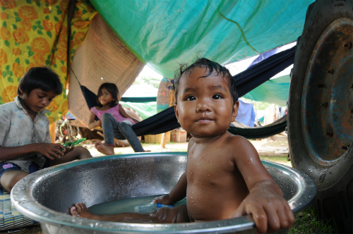 ブルーシートの中を覗いてみると、子供たちがたらいで水浴びしたり、ハンモックでぶらぶらしたりと、平和なものです。