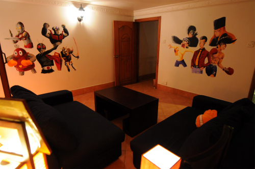 さて、この「横浜」には実は隠れテーマの「大人の遊び」ルームがあるのです。それが中二階にあるプライベートルーム、通称「ライダールーム」。仮面ライダー、メーテル、ガンダム、明日のジョー、マジンガーZなどがペインティングされています。