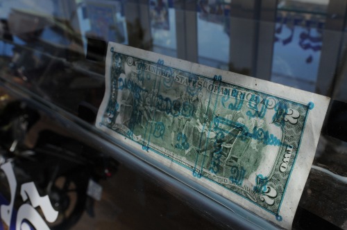 で、それはさておき、両替所や宝石売り場、ついでにコンビニなどでもよく見かけるのが、2US$に落書きしているやつ。