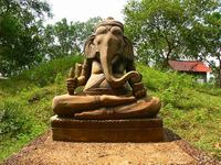 自転車がやっと通れるくらいで、あとは大変、完全なまでのでこぼこ赤土小道を抜けると左手に大きな環濠が見える。まずここが先に示していた寺院「プラサットカッセン」に間違いなかろう。東西に抜ける参道を渡り崩壊が進んだ寺院を見る。寺院整備こそ行われていないが、1メートルほどの知恵神ガネーシャとバラモン僧の像がある。造られてそれほど経っていないようだが、カンボジアでこの様に配置されることは珍しい。寺院をぐるぐる回っていると子供たちとガキ大将が凧あげを楽しんでいた。