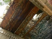 次の目的地はバンテアイトープ(軍隊の砦)寺院に決定。この寺院にはすでに5回ほど訪れており、比較的あっさり辿り着いた。敷地外部から寺院全体を見渡すと三つののっぽ祠堂が三兄弟のように背較べしている。そのまま手前に建つ背が高いのっぺり寺院に入る。彫刻などはあまり残っていないが、興味深いのは木製の天蓋の残骸だ。砂岩に刻まれた蓮の花とサイズこそ違えどきっちりと彫りこまれている。最近崩れ落ちたばかりなのだろう、奥の祠堂の入り口部には真新しい砂岩の破片が残されている。足もとに気をつけながら内部に入ると緑色の細いヘビが足音に気付いて逃げて去った。