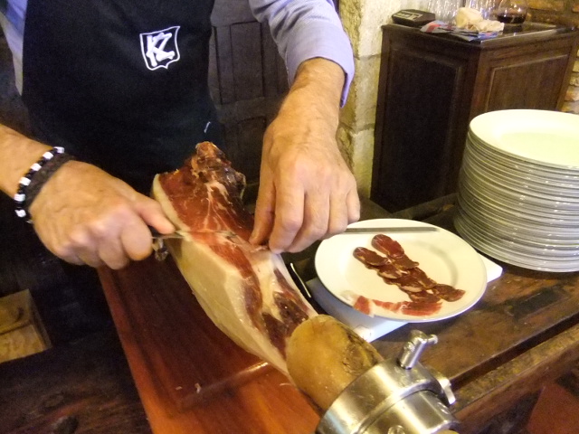 レストランに着いたら、まずは地下のワインセラーでおつまみの生ハムを食べながらワインを選びましょう!
